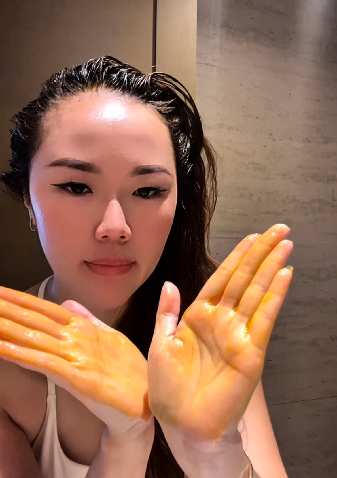 Ambil sedikit Miskita Batana Oil di ujung jari, lalu gosokkan hingga meleleh.